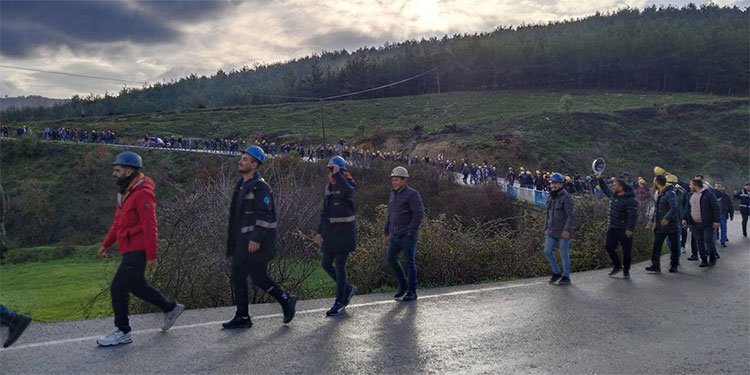 İzmir’in Kınık ilçesinde faaliyet gösteren Polyak Eynez Madencilik’te çalışan 1243 maden işçisi, ödenmeyen ücretleri, banka promosyonları ve özlük haklarının güvence altına alınması talebiyle yürüyüş başlattı. Dün sabah saat 08.00’de çalıştıkları maden önünden Kınık’a yürüyen işçilere yerel halk da destek verdi. Yurttaşların yürüyüşe desteğiyle birlikte maden emekçilerinin korteji daha da büyüdü.